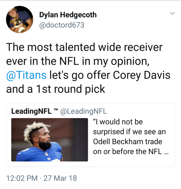 Supdawg Posted March 27, 2018 Report Share Posted March 27, 2018 32 minutes ago, Jonboy said: Schefter has said he wouldn’t be surprised if OBJ is traded during or before the draft. So...would you want him on the Titans? And if so, what would you give up? Fuck no Link to post Share on other sites More sharing options...