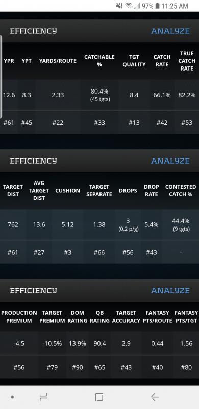 By this metric 45 of the 56 passes thrown to him were catchable.   44% were contested and you believe he runs good routes?  If he's as fast as some of you say, and runs as good of routes as some of you claim, why are 44% of his catches contested?