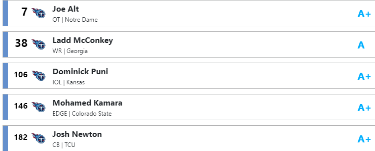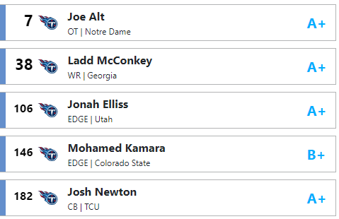 Justafan Posted March 31, 2024 Report Share Posted March 31, 2024 5 hours ago, titanskick8851 said: Mine is relatively similar. I’m good with Nabers or MHJ if they fall or if they want to trade down and get Fashanu or Fautanu as well, so I don’t think you can go wrong with any of them or Alt. If by miracle you could trade down to 9 or 11 and pick up a day 2 pick, it makes it easier to go WR in the second. Love Wilson at 38. I feel you. I waffle every day. I don't think you can pass on Nabers or MHJ if they are there, but I don't think either will be there. I tried to make my list as realistic as possible based on what we know from contacts, benchmarks the Titans look for, and the scheme they'll be running. Obviously, that won't be their draft, but I'm confident there is a future Titan or two somewhere on that list. Link to post Share on other sites More sharing options...