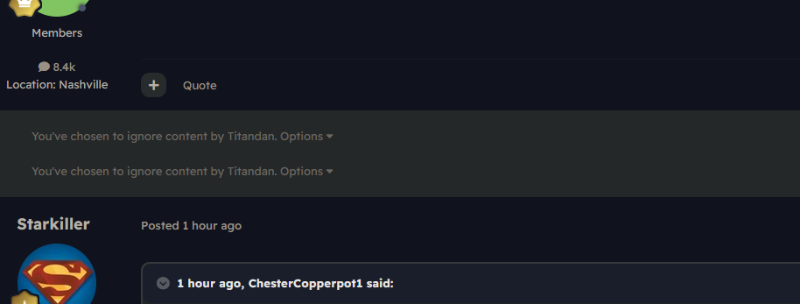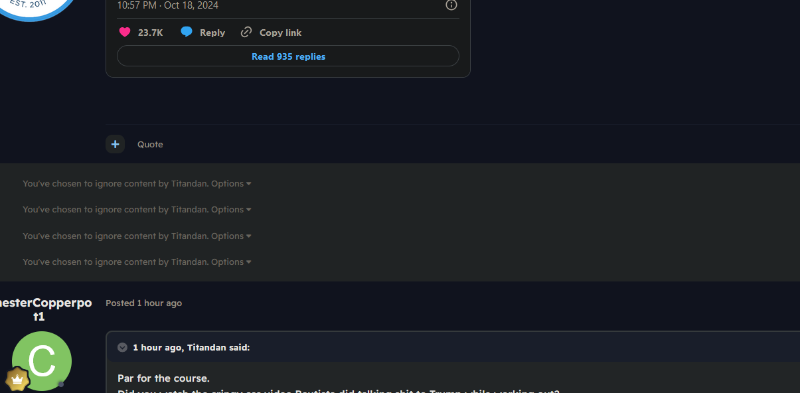 Strunk'sDessert Posted October 20, 2024 Report Share Posted October 20, 2024 1 hour ago, Titandan said: Thought you were done with me. You tagged me, dip ass. I don't have you on ignore because I love to see you be a pathetic little hound dog. But I'll follow up on my word from here on out to not engage you. Also, is this guy just @Mercalius under an alias? He's been quiet lately. Link to post Share on other sites More sharing options...